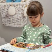 Amelia este o fetiță blândă și creativă. Iubește să coloreze cu pasiune și să facă puzzle-uri – aceste activități o calmează, o concentrează și îi aduc zâmbetul pe față.
